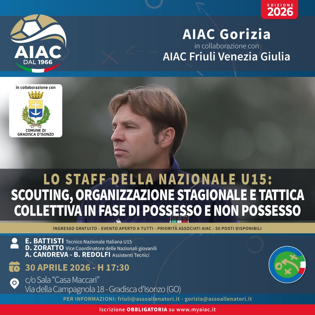 Il gruppo dell'Associazione Italiana Allenatori di Calcio A.I.AC di Gorizia, in collaborazione con gruppo regionale organizza il giorno 30 aprile alle ore 17.30, presso la sala "Casa Maccari" di Gradisca d'Isonzo, un incontro formativo per gli allenatori del territorio. Sarà presente lo staff della Nazionale Italiana U15 che parteciperà al Torneo delle Nazioni al via questo sabato 25. Il tecnico Enrico Battisti, coadiuvato dagli assistenti Antonio Candreva e Bruno Redolfi, tratterà il tema sull'organizzazione della stagione, sullo scouting, per proseguire nella parte tattica nelle due fasi di possesso e non possesso palla. All'evento, sarà presente anche il vicecoordinatore delle nazionali giovanili Daniele Zoratto. Si ricorda agli allenatori che è necessaria l'iscrizione all'evento sul sito Myaiac.
