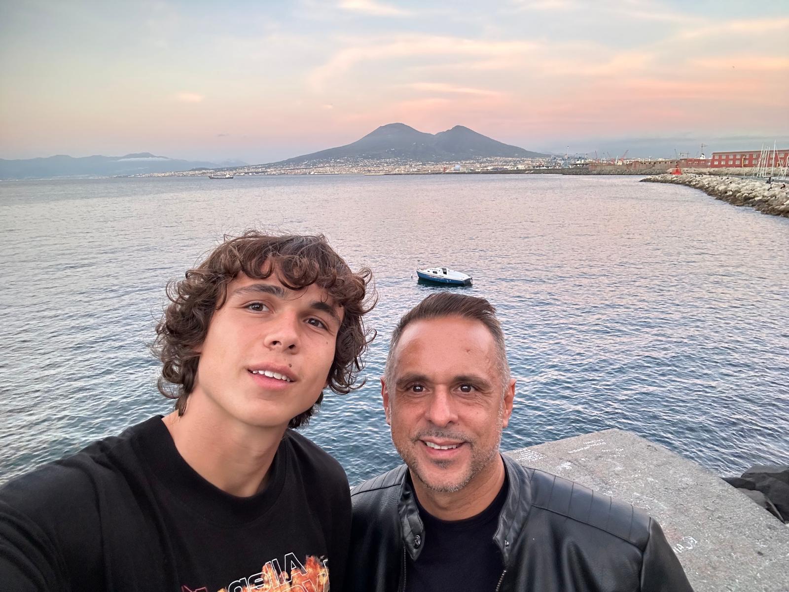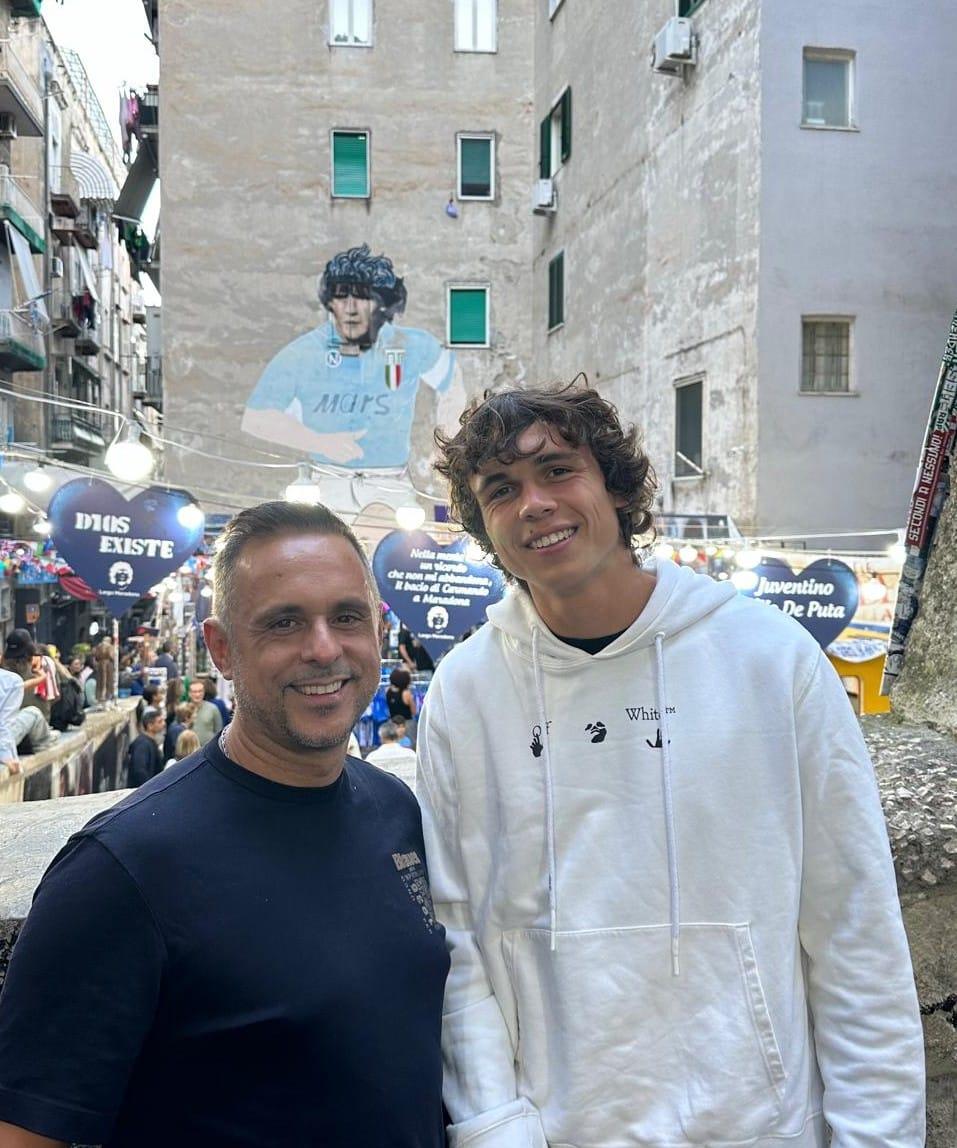 Padre e figlio sotto il famigerato murales di Maradona: